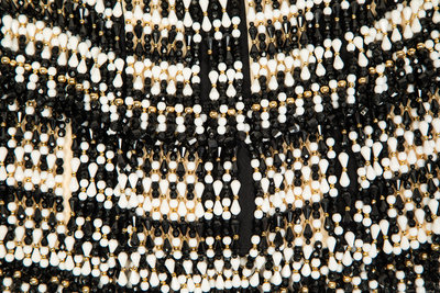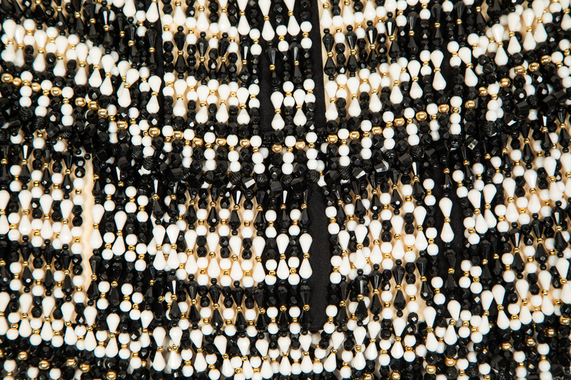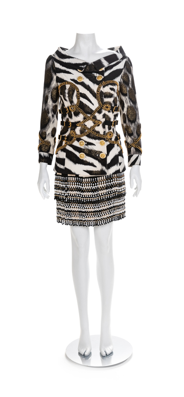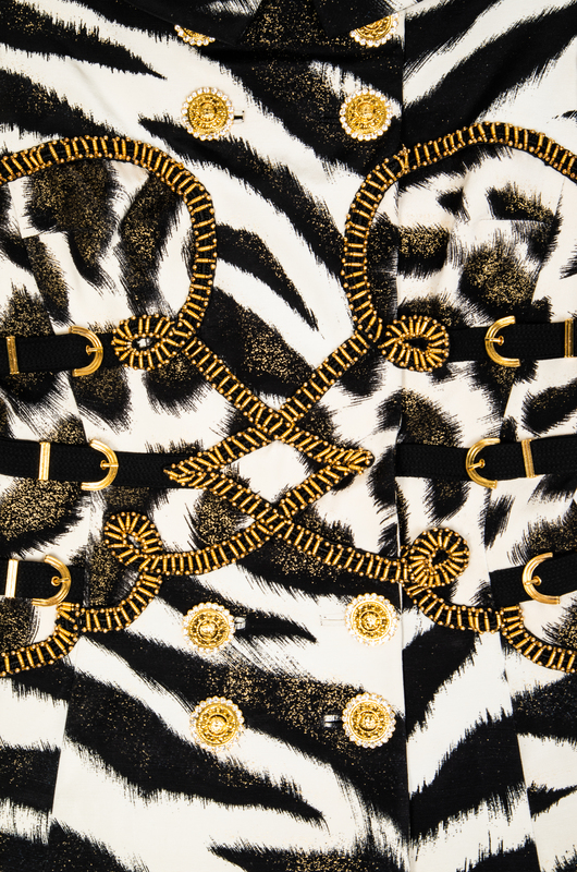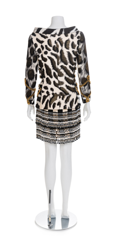 Jacket is made of a black and white zebra-print silk woven with gold thread and embroidered with goldtone and glass beads and black belts with goldtone decorative buckles. Jacket has a cuffed scooped neckline, long sleeves and a center front double breasted closure with goldtone Medusa head buttons. Silk skirt is printed with vertical black and white stripes and finished with a double hem of heavy black, white and gold bead fringe. The skirt is lined with cream silk and closes at with a zip at the side seam. Label: Atelier Versace