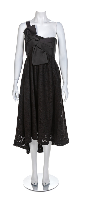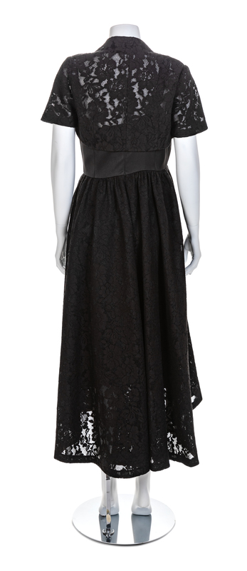 Lace with single shoulder strap, bodice with twist bow detail and empire waistline, high/low hemline, black lining with back zip closure. Together with a matching short sleeve shrug. Dress Label: Zac / Zac Posen / Made in China Shrug Attributed to Zac /Zac Posen