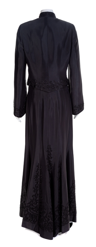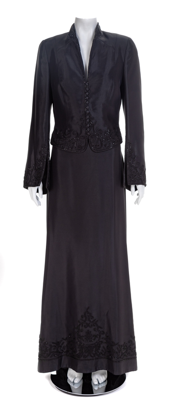 Black taffeta jacket and skirt embroidered with black rope and black beads. Jacket has a pointed lapel, long flared sleeves and a center front covered button and loop closure. Long flared skirt with a center back zip. Label: Carmen Marc Valvo CollectionWorn by Natalie Cole