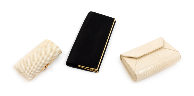 First: Black satin bag with goldtone handle and strap. 'Made in Italy' label, no designer label. Second: Off-white leather clutch with off-white suede lining and gold detachable strap. 'Made in Italy' label, no designer label. Third: Faux pearl clutch with goldtone hardware, gold leather lining and goldtone strap. No label.