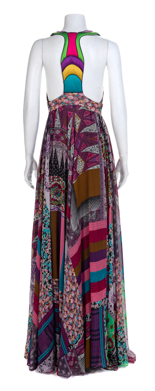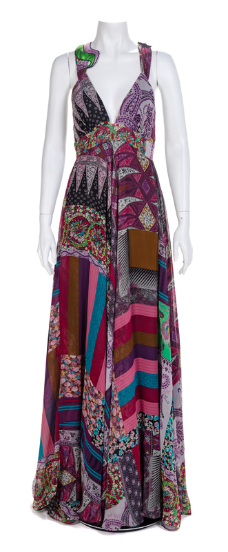 Multicolor patchwork print dress with a halter top attached to a green and pink quilted strap that extends over the shoulder and reattaches at the waist. A long and full skirt is slightly gathered into a waistband and has pleated side panels. The dress is lined with a sheer silk crepe and closes down the side with a zip. Label: Etro / Made in ItalyWorn by Natalie Cole