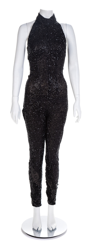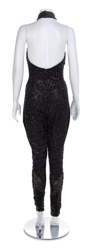 Halter neck black beaded net jumpsuit with tapered trousers with zippers at the hem. The jumpsuit is beaded allover with black bugle beads with a design at the hem of each leg with black sequins and beads. A center back zipper at the waist and hook and eyes at the back neck. Label: Fabrice / New York / CoutureWorn by Natalie Cole