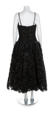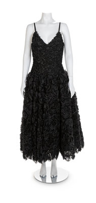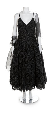 A boned inner bodice support this dress which is embellished allover with black ribbons. The bodice is further emnellished with black rhinestons and the full net skirt is covered with ribbon flowers and rhinestones. The dress has thin black ribbon straps and closes down the center back with a zip. A separate scarf of black sheer fabric is included. Label: Isaac MizrahiWorn by Natalie Cole