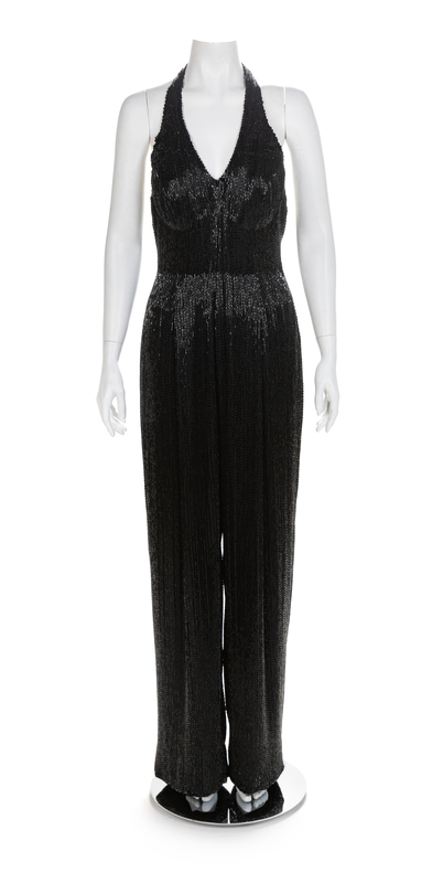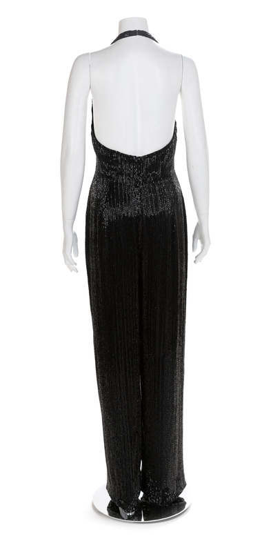 Halter neckline, boned bodice, wide legs pants and a center back zipper. Black glass bugle beads cover the entire jumpsuit. Elastic is sewn down the sides of the bodice to aid in fit.Label: J&M Costumers HollywoodWorn by Natalie Cole