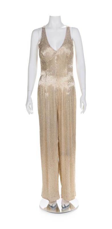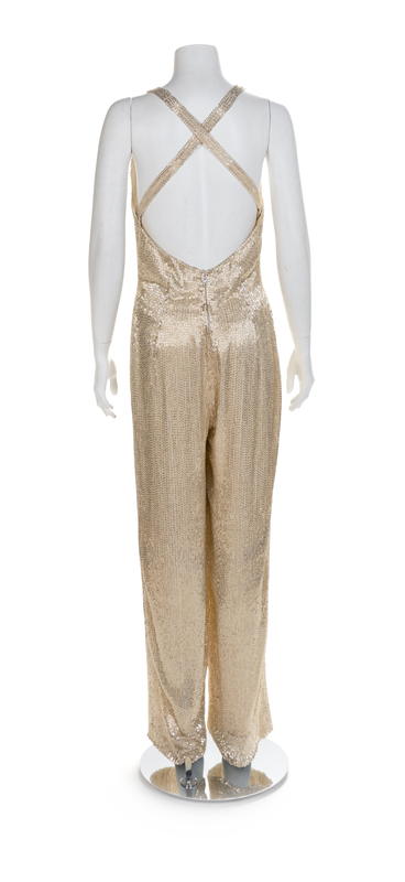 Sleeveless v-neckline with straps, underwire, wide legs pants and a center back zipper. Jumpsuit is covered with clear/silver bugle beads. Elastic is sewn down the sides of the bodice to aid in fit.Label: J&M Costumers HollywoodWorn by Natalie Cole