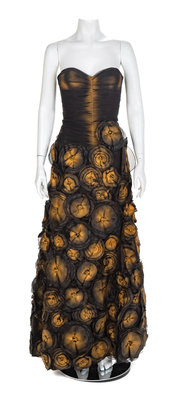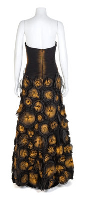 Strapless black shirred net dress with a full skirt of circular fabric flowers. Black spray paint accents on the bodice and ceter of each flower. A boned inner bodice supports the dress, which closes down the center back with a zip. Label: JovaniWorn by Natalie ColeA note on the dress states it was worn in California, Lousiana, Nevada and in the country of Georgia.