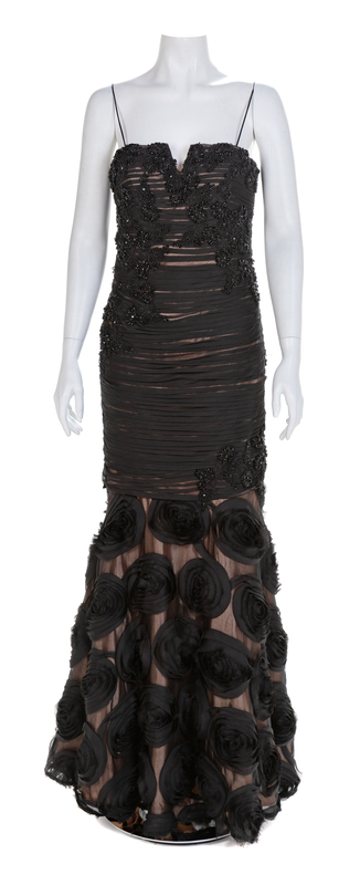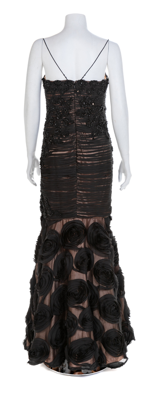 Black sheer horizontal pleating and full skirt underlined with a peach fabric. The bodice is embellished with lace and bead applique and the skirt with tulle flower embroidery. Center back zipper and hook and eye closure. Label: Jovani Worn by Natalie Cole