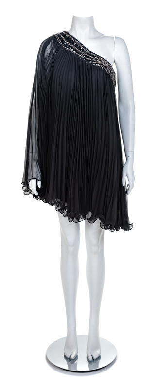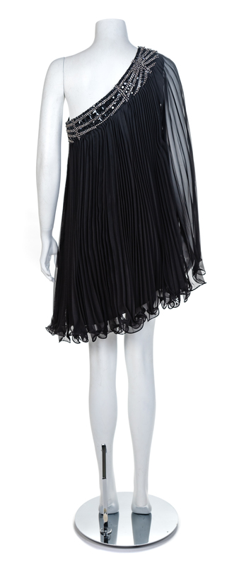 Pleated black sheer dress with a wide scoop neckline embellished with cut glass squares and rhinestones. A black lining has an armhole for the right arm and a pleated sheer black fabric sleeve. Label: JovaniWorn by Natalie Cole