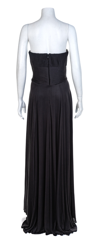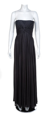 Strapless silk knit jersey dress supported by a boned inner bodice and embellished with a pleated twist design. A heavily pleated skirt hangs from the boned bodice. The dress closes down the center back with a zip. Label: Lloyd Klein / Couture / 100% Silk