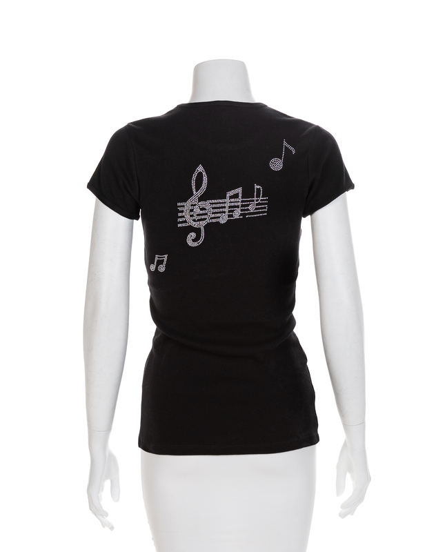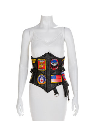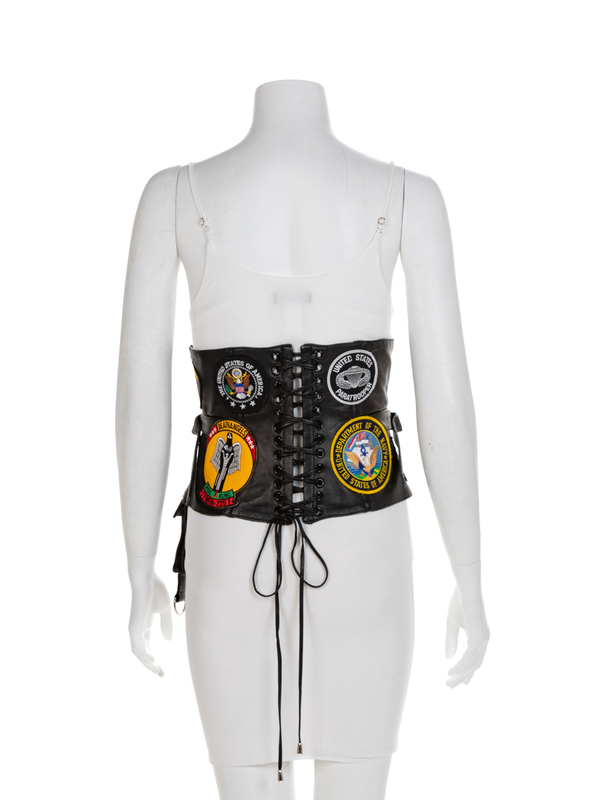 Black leather corset with twelve military related patches, a side leather pocket and adjustable straps with center back lacings and center front hook and eyes. Label: LSO DesignsBlack knit t-shirt printed with 'The Real Diva' on front and musical notes on back in glitter and rhinestones with scoop neck and short sleeves. Label: BellaWorn by Natalie Cole