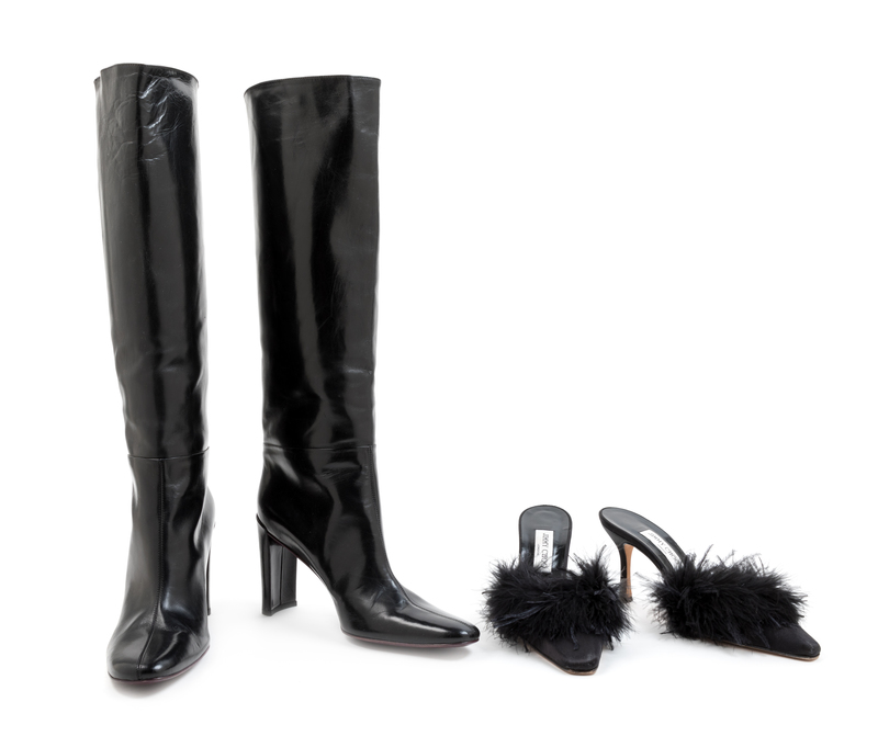 Black mules with feathers. Label: Jimmy Choo Size 40.5Black knee high boots. Label: DKNY Size 9.5Worn by Natalie Cole