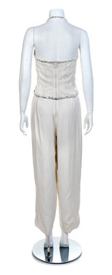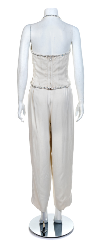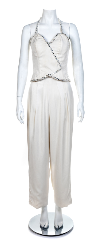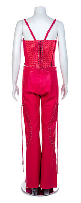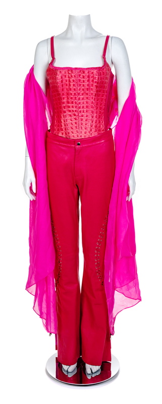 Both ensembles are made with a boned and trousers. The pink leather ensemble is made of a bustier, trousers, scarf and hat. The white ensemble is made of a bustier and wide trousers. White ensemble: J&M Costumers HollywoodPink ensemble: LSO DesignBoth ensembles were worn by Natalie Cole. The pink ensemble was worn twice in 2004: to "The Apollo at 70: A Hot Night in Harlem at The Apollo Theater" in New York and to the "11th Annual Race to Erase Multiple Sclerosis" benefit in Los Angeles. Worn by Natalie Cole