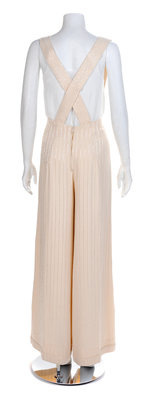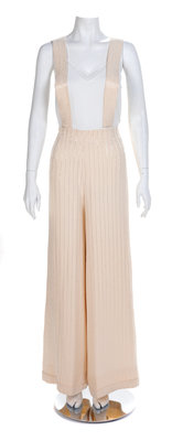 the first; black pants with black glass bugle beads, black lining with a back zip closure, the second; cream pants with clear glass bugle beads, cream lining with a back zip closure, together with a matching decorative suspenders, the third; green/gold pants, heavily beaded with bronze glass bugle and round pink beads, brown lining with a back zip closure. Unlabeled