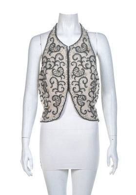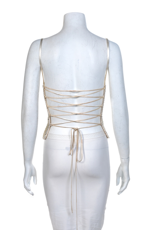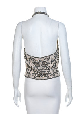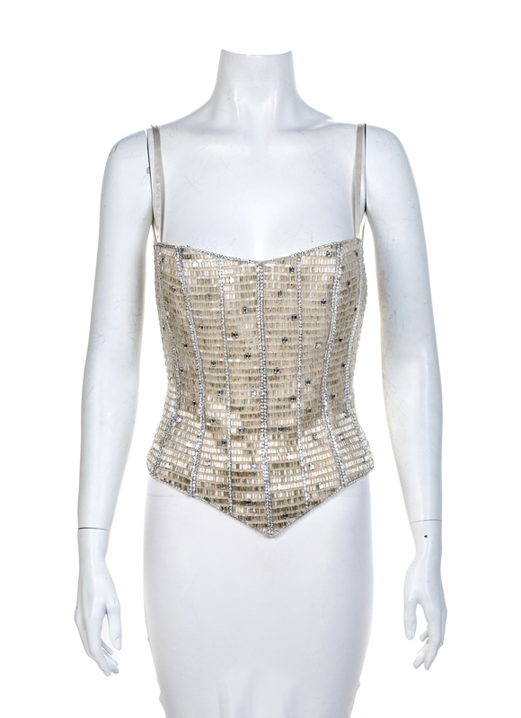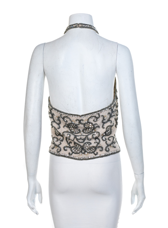 J&M Costumers Hollywood halter top covered in white and grey glass beads and rhinestones. The top is lined with white satin and closes down the center front and back neck with hook and eyes. Badgley Mishka top is the front of a boned bodice that is covered with glass beads and rhinestones with an open back of criss-cross lacing and shoulder straps. Worn by Natalie Cole
