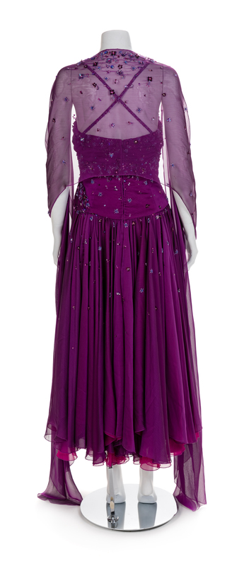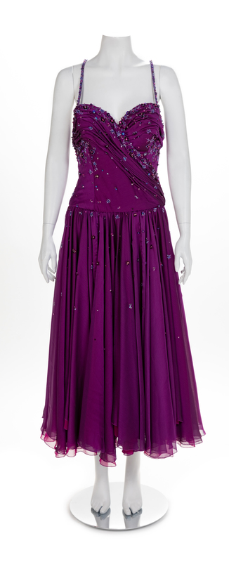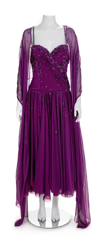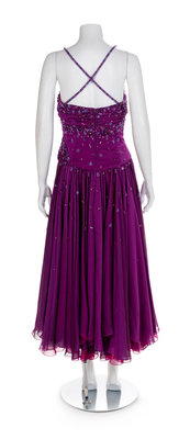 Both dresses are made of a similiar pattern of a thinly strapped boned bodice covered with draped and beaded crepe. The bodice is attached to a full skirt that is gathered into the waistline. Both dresses close down the center back with a zip. The purpled dress has a matching beaded scarf. UnlabelledWorn by Natalie Cole