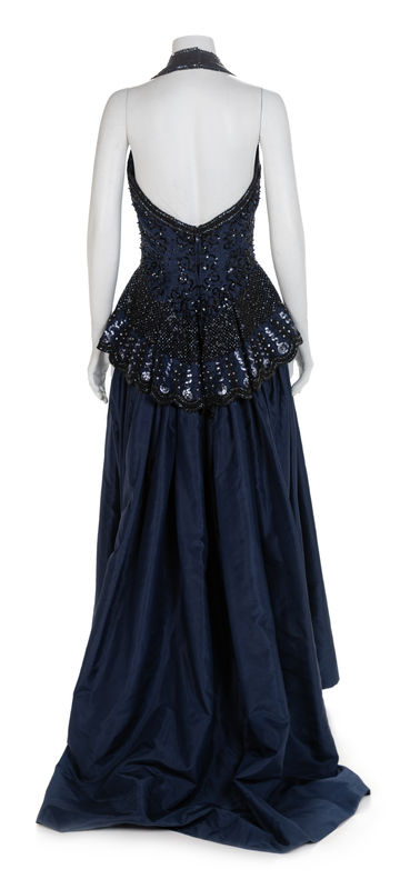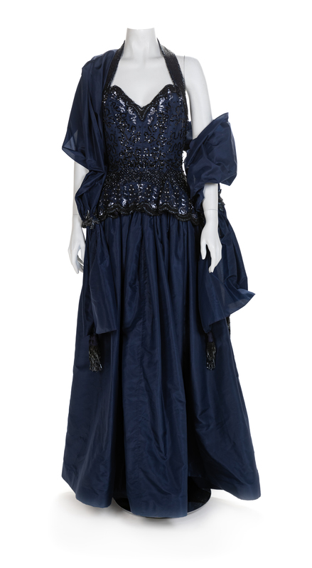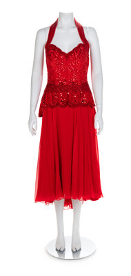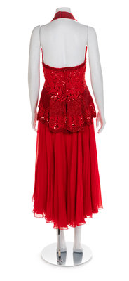 Both dresses are cut with a similar pattern for the halter bodice, which extends to a flared hip. The bodice is embroidered with sequins and multiple sizes of glass beads. The blue skirt is made of taffeta and is floorlength, while the red skirt is shorter and made of crepe. The blue dress has a separate taffeta shawl with bead embroidery and tassels. Red dress label: Fabrice / New York / Couture Blue dress: Unlabelled. Attributed to FabriceWorn by Natalie Cole