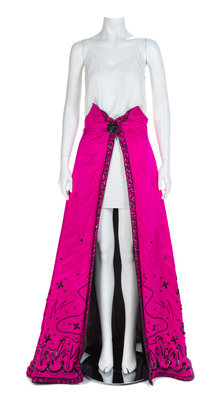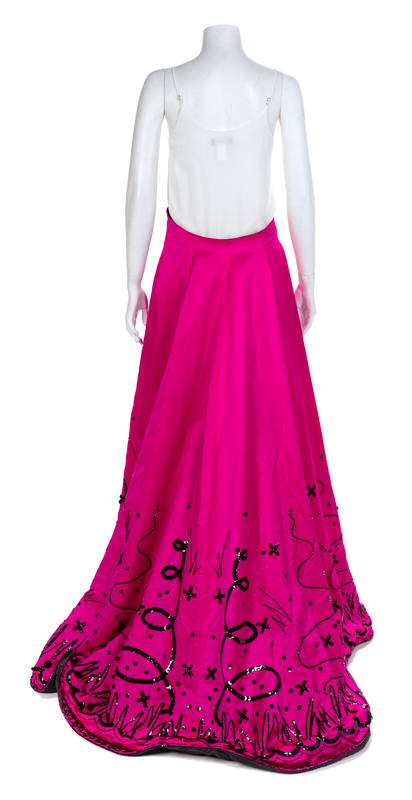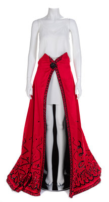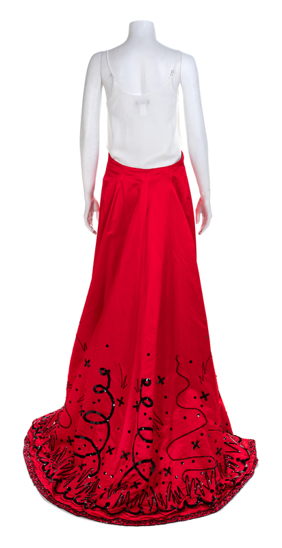 Both skirts are cut from a similar pattern and made of silk satin embellished with black sequins and beads. The wide sweeping skirt are open down the center front and secured at a fitted waist with a large hook and eye. The center front of the skirt is stiffened with a long piece of boning. Label: Fabrice / New York / Couture Worn by Natalie Cole