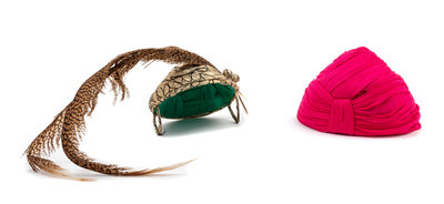 One pink turban-style hat and one gold cap with bird feather.