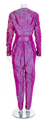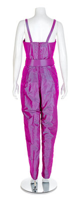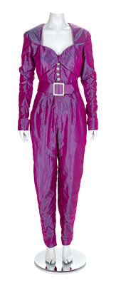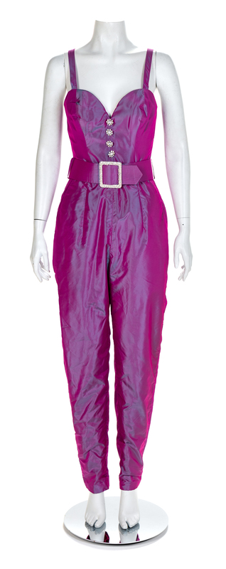 Pink and purple iridescent taffeta jumpsuit with a matching bolero. The jumpsuit has a boned inner bodice, four decorative rhinestone buttons down the center front, thin straps, tapered legs and hip pockets. The jumpsuit closes down the center back with a zip and wide belt with silver buckle. The bolero has a stylized neckline, long sleeves with a large rhinestone cuff and closes at the center front with two hooks and eyes.Unlabelled Worn by Natalie Cole