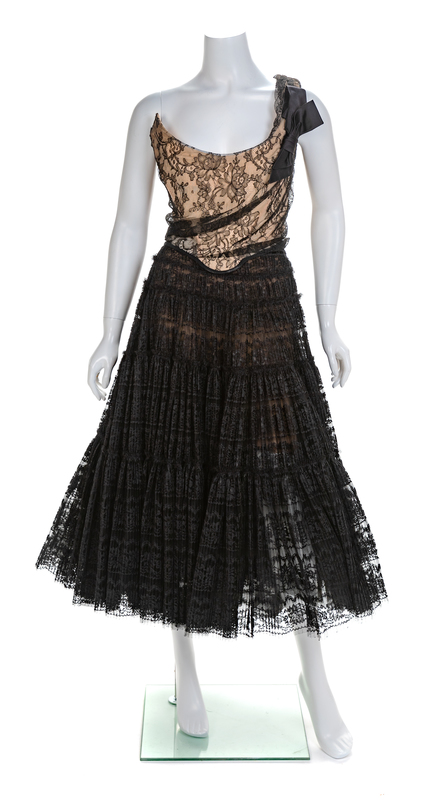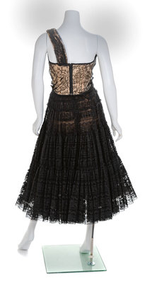 Asymmetrical boned corset inspired by the 18th century and covered in draped black lace that extends onto the left shoulder strap. A large black satin bow is attached to the front left of the corset. The main/inner part of the corset is made with peach powernet. The corset closes at the center back with a separating black zipper. Bust pads have been sewn on the inside of the corset. Full black lace skirt made of pleated horizontal bands of black floral lace and lined with numerous layers of black net and peach jersey. The skirt closes with a zip and hook and eye. Corset label: Vivienne Westwood / LondonNo designer label in skirt. Worn by Natalie Cole