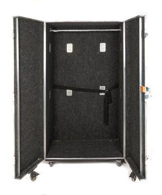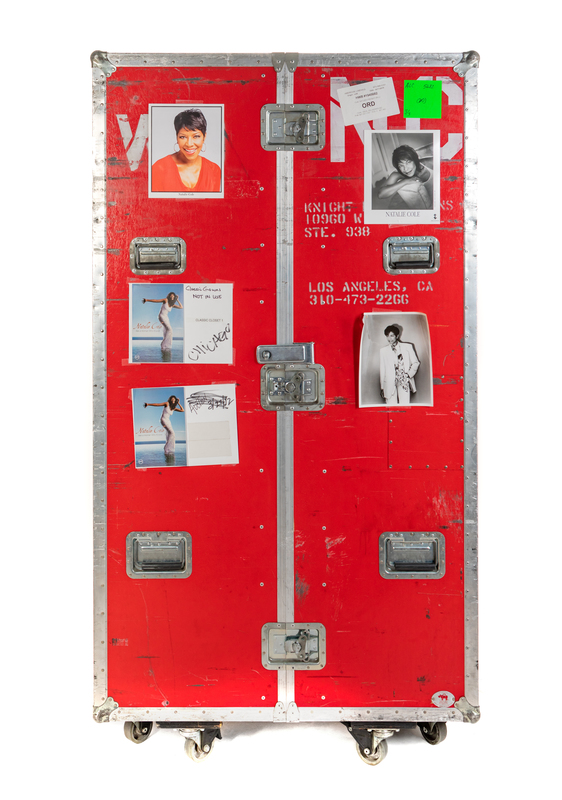 grey lining with one interior strap, wheels with push down lock. Used by Natalie Cole when touring.