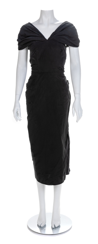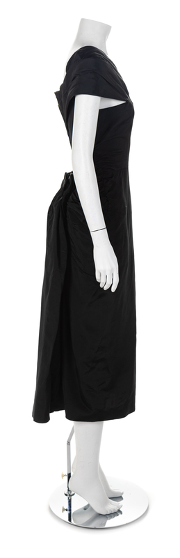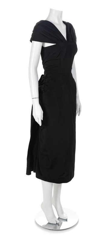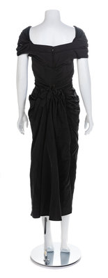 Black ribbed wilk with gathered shoulders that wrap to the back bodice, fitted silhouette, pleated back hip with connected bustle that secures with hook and eyes on the hip. The dress closes down the center back with a zip. UnlabeledDress could be from the 1930s and updated to a later style by shortening the hem.