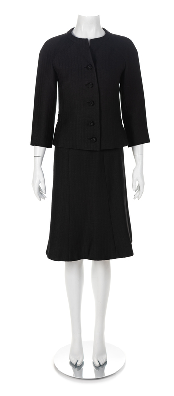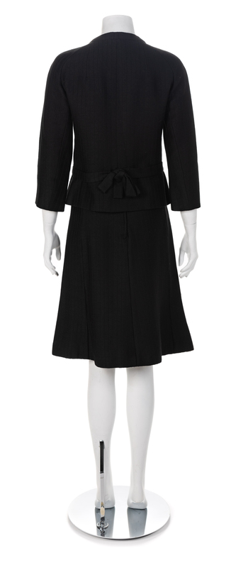 Black wool jacket with scoop neck, 3/4 length raglan sleeves and back waist belt tied into a permanent bow at the center back. Black silk lining and bound button holes sewn by hand. Center front black glass bead buttons. Little below the knee trumpet skirt gathered into waistband and closed down the center back with a zip. Jacket label: Christian Dior - New York Inc