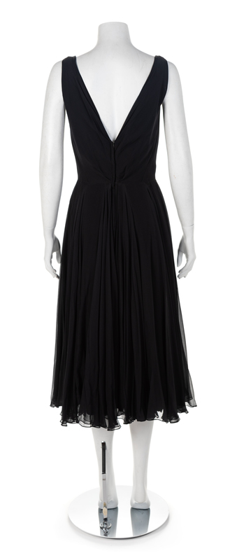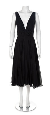 Sleeveless black silk chiffon dress with gathered and pleated surplice neckline and full skirt with a black silk lining. Dress is closed down the center back with a zip. Label: Ceil Chapman