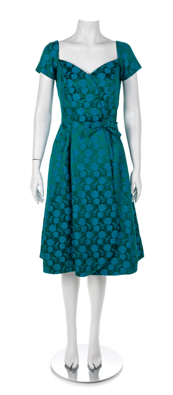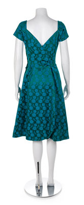 Green and blue silk brocade in a floral design. The dress is cut with a complex and fitted design with a sweetheart neckline, cap sleeves anda princess line skirt with multiple darts into the fitted waist. The back surplice neckline extends to the waist where it is secured with a self-fabric bow and extends further into a sweeping hem. The dress is closed down the side seam with a zip. A petticoat is required to produce the correct silhouette. Labeled: Grenella Estevez.
