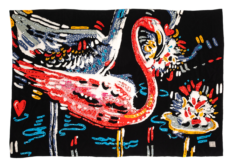 Black silk shawl with multicolored print with sequin embellishments on one side. Lablel: Michaele Vollbrach