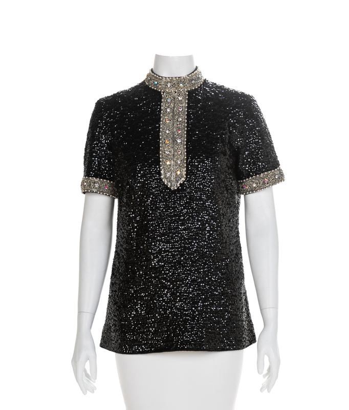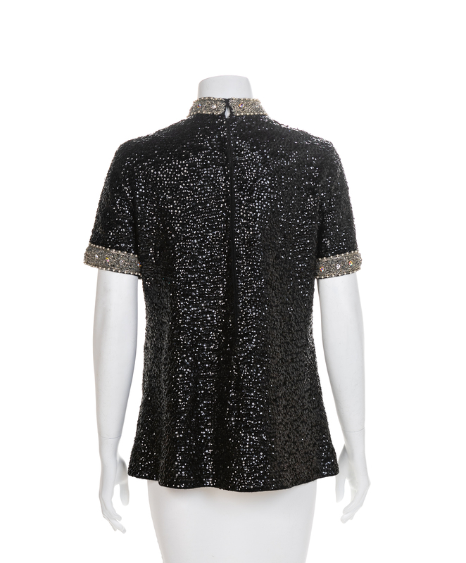 Black knit top covered with black sequins and edged with glass beads, faux pearl and rhinestones that extend down the center front. The top has a stand collar, short sleeves and closes down the center back with a zip. Black lining is sewn in by hand. Label: DePaul / New York