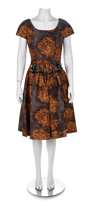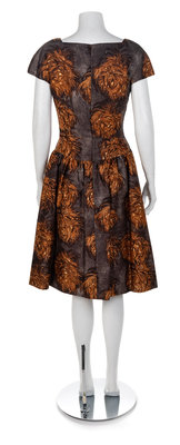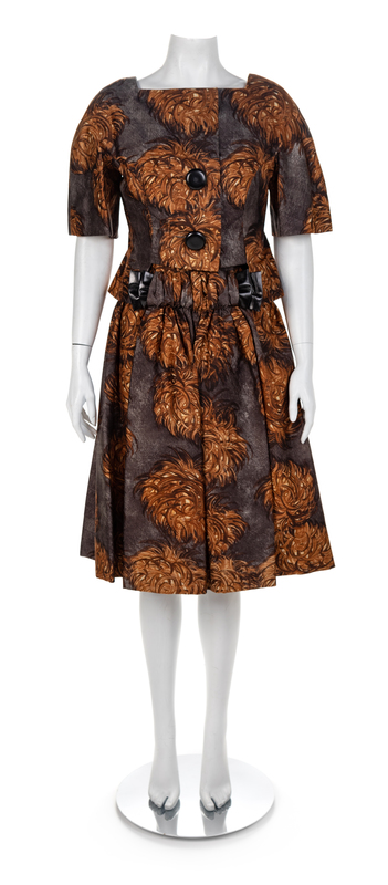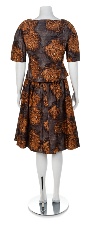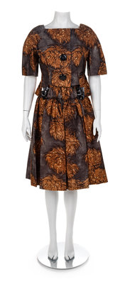 Grey silk printed in a white and brown fauna pattern. The dress has a wide scoop neck, short cap sleeves and a wide skirt that is pleated and gathered into the dropped waistline. A wide gathered casing at the center front waistline holds a 'bow' of dark brown shiny material. The dress closes down the center back with a zip. The jacket has a squared scoop neck, short sleeves and a center front large black leather buttons. A rectangular panel is taken out of the waistline of the jacket front. The jacket is lined in a brown taffeta. Label: ScaasiThe dress has its original retail label from William Penn in Pittsburgh and is listed as being sold for $475.00