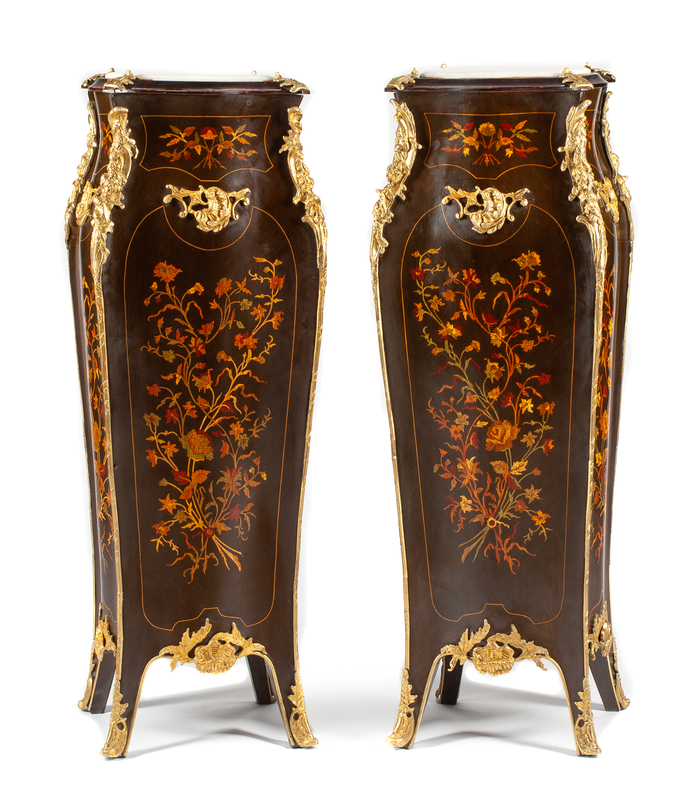 A Pair of Louis XV Style Gilt Bronze Mounted Marquetry Pedestals Height 46 x width 16 x depth 16 inches.