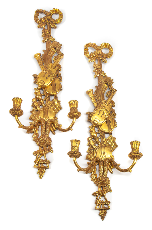 A Pair of Louis XV Style Giltwood Two-Light Sconces Height 40 inches.