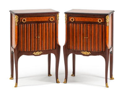 A Pair of Louis XV/XVI Transitional Style Gilt Bronze Mounted Parquetry Night Tables Height 33 x width 22 x depth 14 inches.