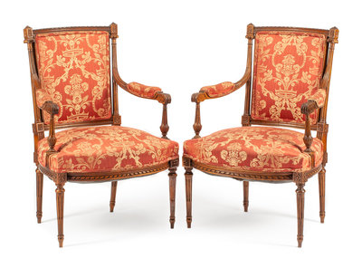 A Pair of Louis XVI Style Walnut Fauteuils Height 38 inches.