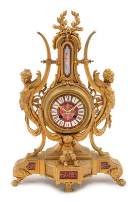A French Neoclassical Porcelain Mounted Gilt Metal Mantel Clock Height 19 x width 12 1/2 x depth 2 1/2 inches.