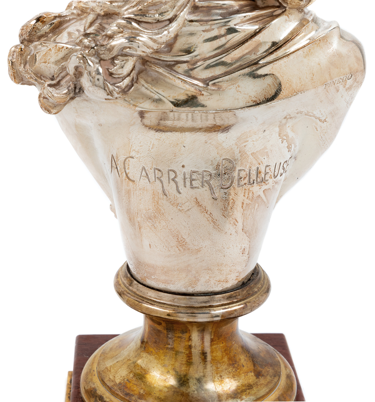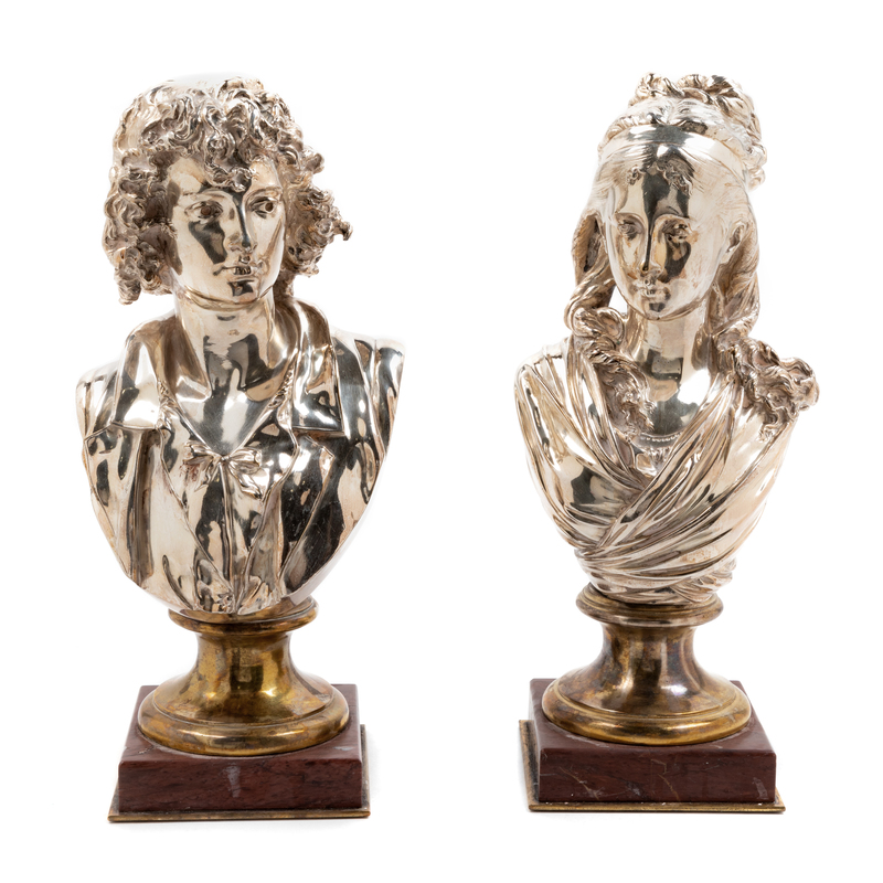 Two French Silvered Bronze and Marble Busts Height of first 12 1/2 x width 6 inches.