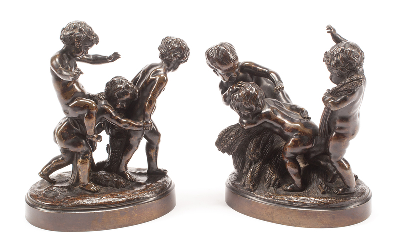 A Pair of French Bronze Figural Groups Height of first 9 1/2 inches.