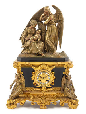 A French Gilt Bronze Mounted Slate Mantel Clock Height 22 1/2 x width 13 x depth 7 inches.