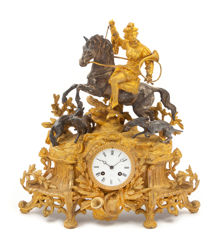 A French Parcel Gilt Cast Metal Mantel Clock Height 18 1/2 x width 15 1/2 x depth 4 inches.