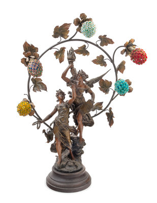cast to show two figures under a leafy ring supporting the five lighting elements with beaded glass shades, signed L&F Moreau.