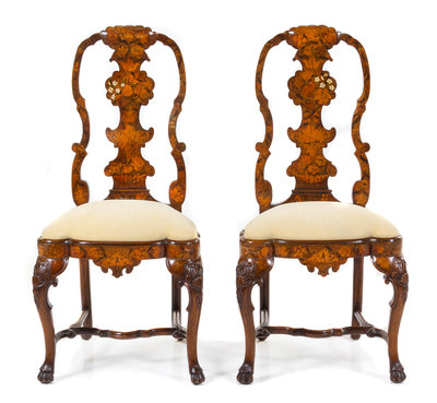 A Pair of Dutch Marquetry Side Chairs Height 43 inches.