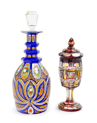 Two Enameled Bohemian Glass Articles Height of decanter 12 1/2 inches.