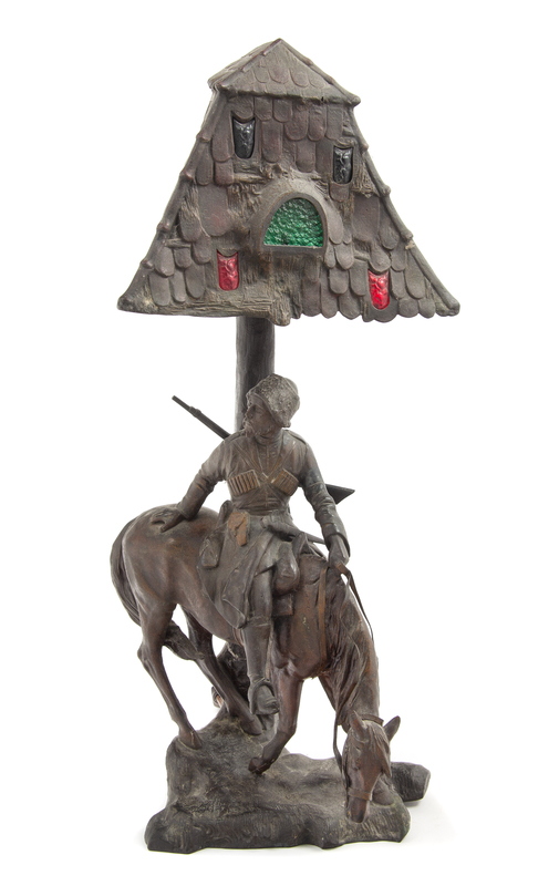 depicting an armed Cossack on horseback beneath a glass inset shingled roof form shade, stamped GERMANY.