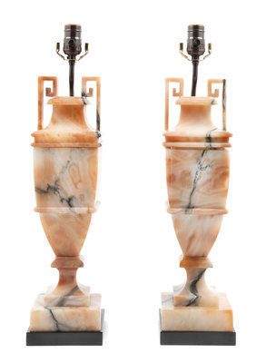A Pair of Alabaster Table Lamps Height overall 22 1/4 inches.