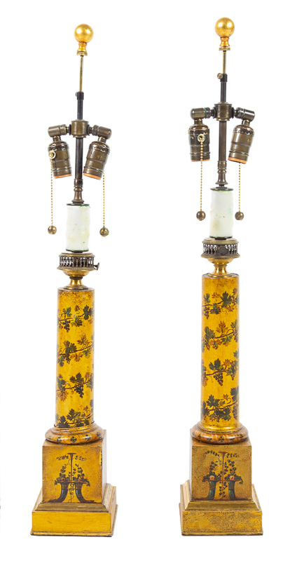 A Pair of Continental Painted Tole Lamps Height overall 21 3/4 inches.