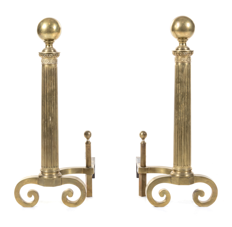 A Pair of Brass Andirons Height 32 x width 26 inches.