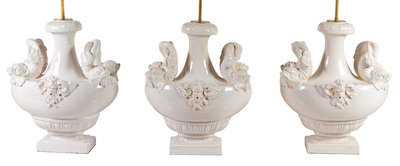 Two Pairs of Italian White-Glazed Ceramic Lamps Height overall 35 inches.
