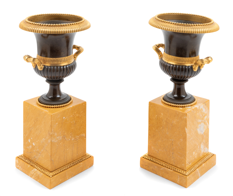 A Pair of Gilt, Patinated Bronze and Marble Campagna Urn Ornaments Height 11 1/2 x diameter 5 1/2 inches.